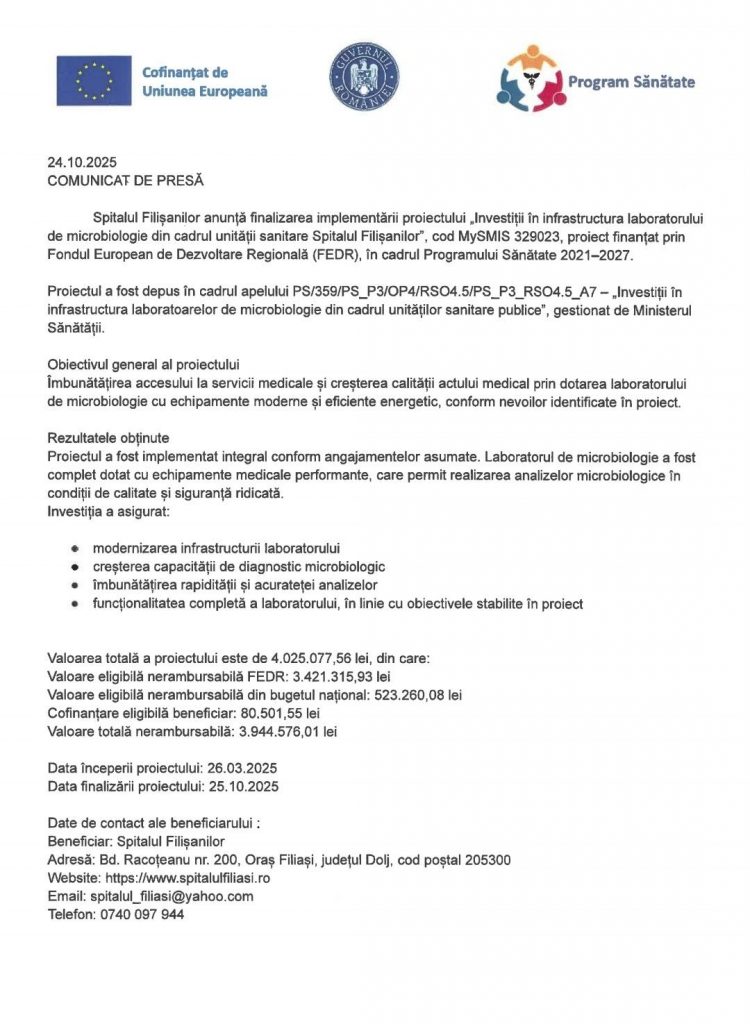 Comunicatul Spitalului Filișanilor privind finalizarea proiectului de modernizare a laboratorului de microbiologie